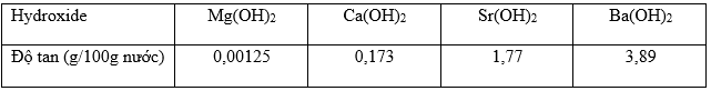 Cho độ tan của các hydroxide kim loại nhóm IIA ở 20°C như