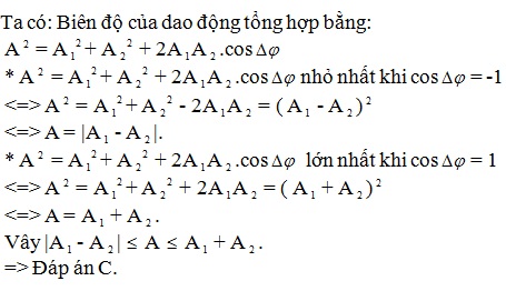 Hai dao động thành phần có biên độ là 4cm và 12cm. Biên độ dao dộng tổng hợp có thể nhận