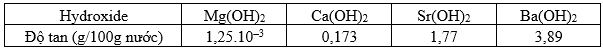 Dựa vào độ tan trong nước của các hydroxide nhóm IIA ở 20°C cho trong bảng sau, hãy cho biết kim