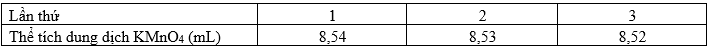 Trong phòng thí nghiệm, nồng độ iron (II) sulfate có thể được xác định bằng phương pháp chuẩn độ theo phương trình hóa học sau: 10FeSO4 + 2KMnO4 + 8H2SO4 → 5Fe2(SO4)3 + 2MnSO4 + K2SO4 + 8H2O. Chuẩn độ 10,00 mL dung dịch FeSO4 và H2SO4 loãng bằng dung dịch KMnO4 0,010 M. Kết quả thu được như sau: