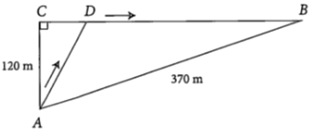 Một chú thỏ ngày nào cũng ra bờ suối ở vị trí A, cách cửa hang của mình tại vị trí B là 370m để uống nước, sau đó chú thỏ sẽ đến vị trí C cách vị trí A 120m để ăn cỏ rồi trở về hang. Tuy nhiên, hôm nay sau khi uống nước ở bờ suối, chú thỏ không đến vị trí C như mọi ngày mà chạy đến vị trí D để tìm cà rốt rồi mới trở về hang (xem hình bên dưới). Biết rằng, tổng thời gian chú thỏ chạy từ vị trí A đến vị trí D rồi về hang là 30 giây (không kể thời gian tìm cà rốt), trên đoạn AD chú thỏ chạy với vận tốc là $13~\text{m}/\text{s}$, trên đoạn BD chú thỏ chạy với vận tốc là $15~\text{m}/\text{s}$. Tính khoảng cách giữa hai vị trí C và D.