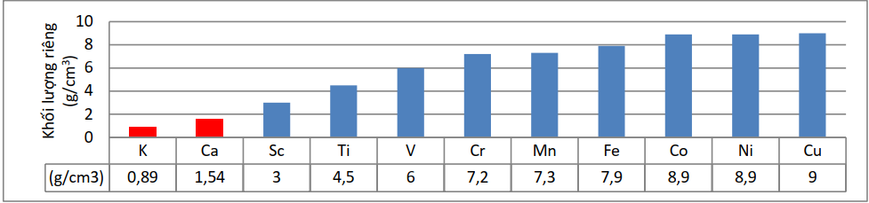 Đồ thị khối lượng riêng của các nguyên tố kim loại chu kì 4 (từ nhóm IA đến IB)Dựa vào