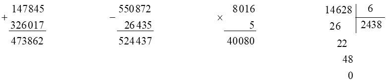 Đặt tính rồi tính: a) 147 845 + 326 017 b) 550 872 - 26 435 c) 8 016 × 5 d) 14 628 :