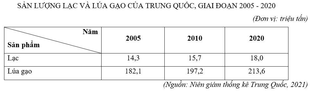 | a) Sản lượng lạc và lúa gạo của Trung Quốc tăng liên tục từ năm 2005 đến 2020. | ||