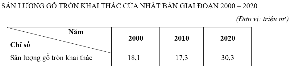 Cho bảng số liệu:Tính tốc độ tăng trưởng sản lượng gỗ tròn của Nhật Bản năm 2020 so