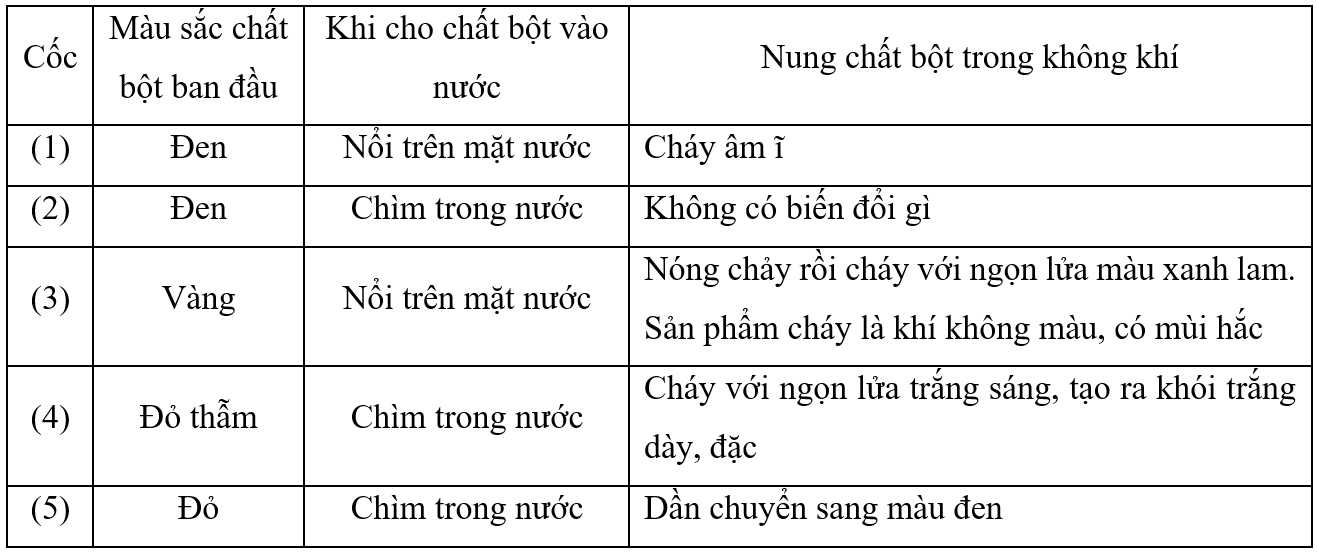 Nghiền các chất rắn: đồng (Cu), copper(II) oxide (CuO), than củi (C), phosphorus đỏ (P) và lưu huỳnh (S) thành bột, rồi cho vào cốc thủy tinh được đánh số ngẫu nhiên từ (1) đến (5). Các học sinh được yêu cầu khảo sát màu sắc, tính chất của năm chất bột này và những quan sát được ghi lại trong bảng sau: