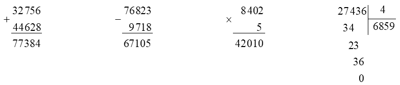 Đặt tính rồi tính: a) 32 756 + 44 628 b) 76 823 - 9 718 c) 8 402 × 5 d) 27 436 :