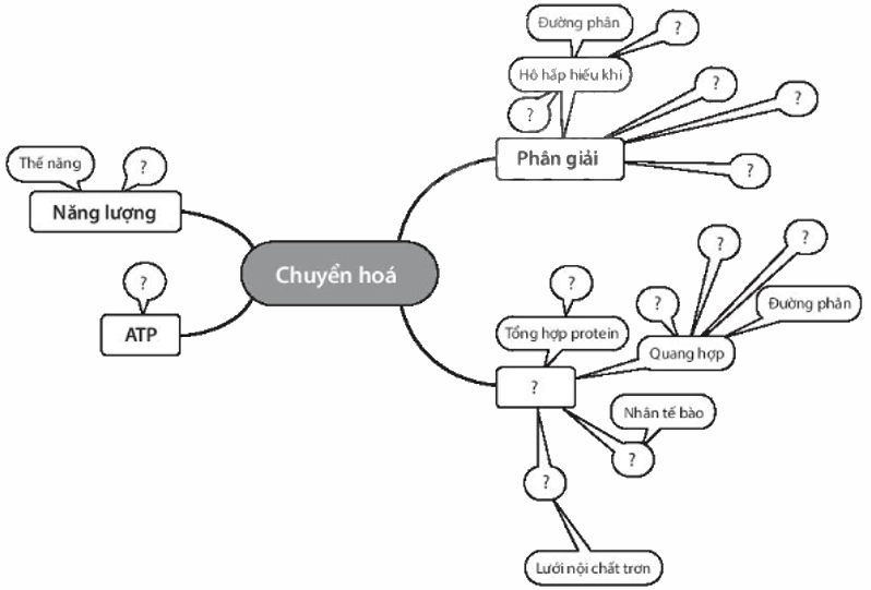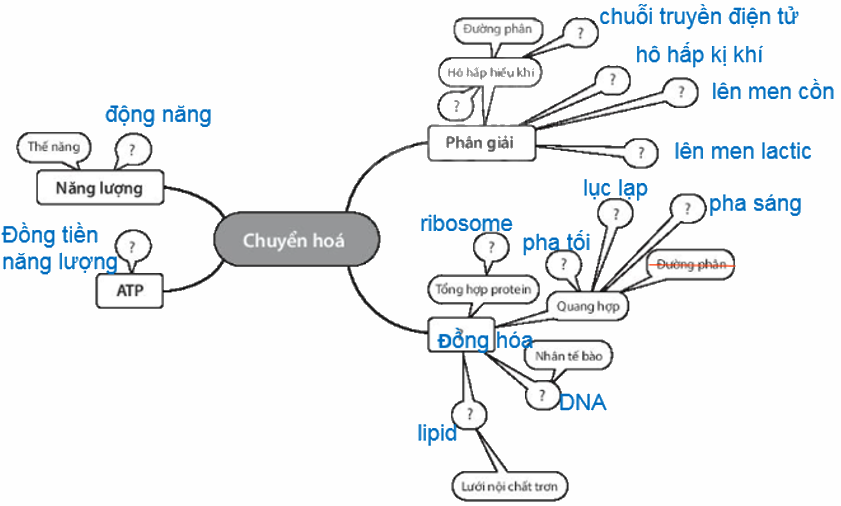 a) Hãy điền tiếp các khái niệm: Đồng tiền năng lượng, chuỗi truyền điện tử, động năng, hô hấp kị khí, lên men cồn, lên men lactic, ribosome, pha sáng, pha tối, lục lạp, DNA, lipid, đồng hóa vào các ô (?) trong bản đồ khái niệm dưới đây và chỉ ra một lỗi sai cần phải bỏ. Lưu ý, một khái niệm có thể điền ở nhiều vị trí.