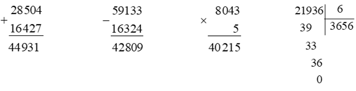 Đặt tính rồi tính: a) 28 504 + 16 427 b) 59 133 - 16 324 c) 8 043 × 5 d) 21 936 :