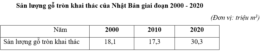 Cho bảng số liệu:Tính tốc độ tăng trưởng sản lượng gỗ tròn của Nhật Bản năm 2020 so