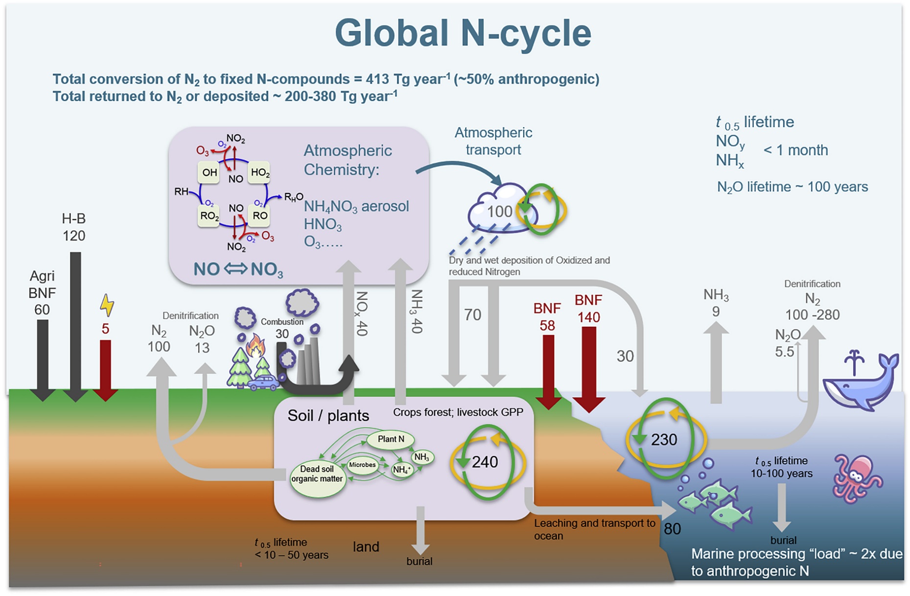 Một nhận định quan trọng là lượng nitrogen cố định do con người tạo ra hiện nay đã tương đương với lượng nitrogen cố định tự nhiên. Điều này đồng nghĩa tổng lượng nitrogen cố định toàn cầu đã tăng gấp đôi trong vòng một thế kỷ kể từ khi quy trình H-B được sử dụng rộng rãi. Việc gia tăng nhanh chóng này khiến hệ thống tái chế nitrogen tự nhiên không kịp xử lý, tạo ra các tồn đọng chưa thể dự đoán hết.