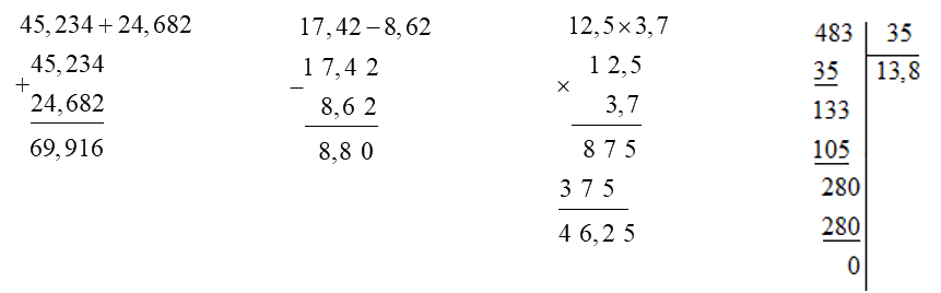 Đặt tính rồi tính: a) 45,234 + 24,682 b) 17,42 - 8,62 c) 12,5 × 3,7 d) 483 :