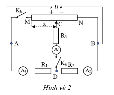 Cho mạch điện như Hình vẽ 2. Điện trở R1=1 Ω, R2=3 Ω, R3=2 Ω, các ampe kế và dây nối có điện trở bằng không. Đoạn MN có RMN=8 Ω, chiều dài MN = 4 cm. Con chạy C di động trên MN sao cho một đầu điện trở R3 luôn tiếp xúc với MN, điện trở mỗi đoạn trên MN tỉ lệ thuận với chiều dài của nó. Chiều dài MC= x. Mắc hai đầu A, B vào hiệu điện thế không đổi U=12 V.