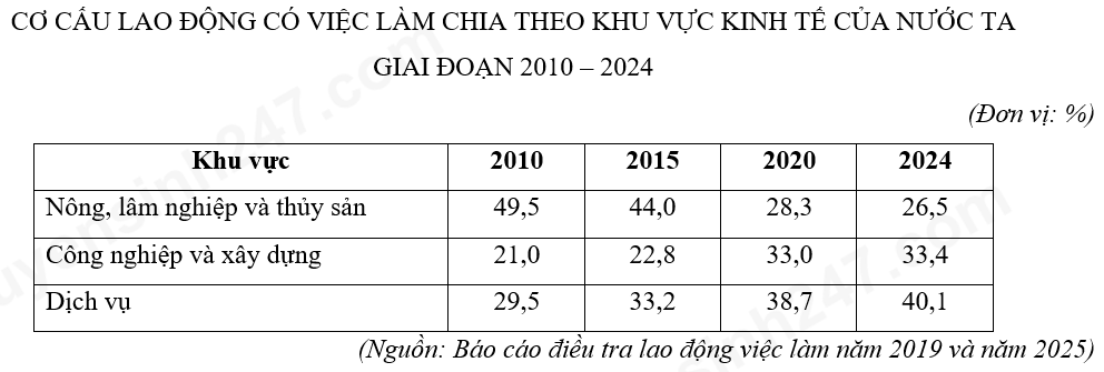 Dựa vào bảng số liệu, nhận xét nào dưới đây không đúng về tỉ trọng lao động đang làm việc phân theo khu vực kinh tế của nước ta giai đoạn 2010 - 2024?