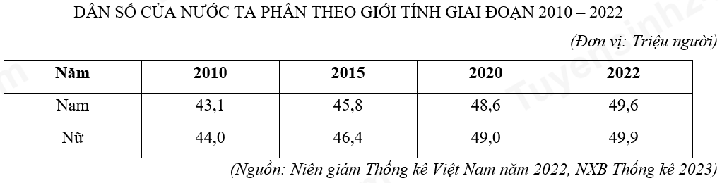 - Từ đó, nhận xét về sự thay đổi tổng số dân của nước ta giai đoạn 2010 - 2022 và dùng biện pháp loại trừ, chọn đáp án đúng.