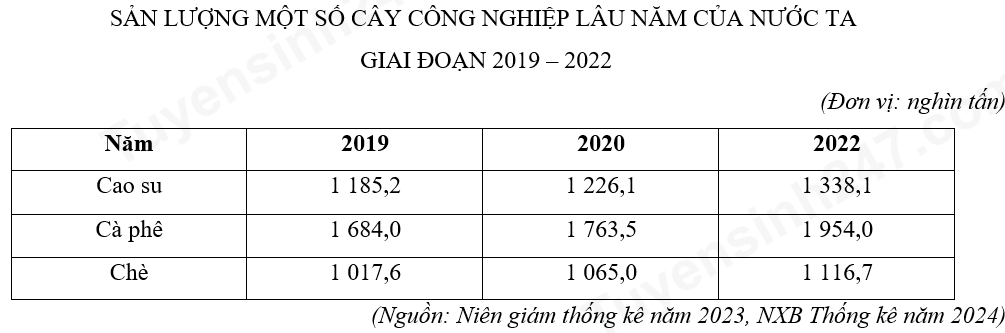 Dựa vào bảng số liệu, hãy cho biết loại cây công nghiệp lâu năm nào có sản lượng tăng nhanh nhất trong giai đoạn 2019 – 2022?