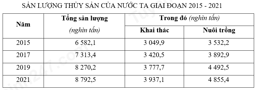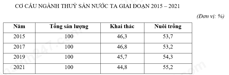 Lập bảng cơ cấu sản lượng thủy sản nước ta giai đoạn 2015 - 2021.