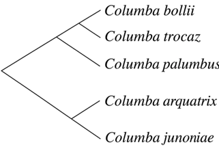 Hình bên mô tả cây phát sinh biểu diễn mối quan hệ phát sinh chủng loại của năm loài chim thuộc giống Columba. Nhận xét nào dưới đây là đúng về mối quan hệ gần gũi giữa các loài trên?