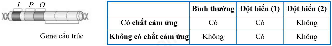 Hình dưới đây cho thấy cấu trúc của một operon lac ở vi khuẩn E. coli, bảng bên dưới thể hiện việc gene cấu trúc được biểu hiện như thế nào khi nuôi cấy chủng E. coli bình thường và hai chủng đột biến (1) và (2) trong môi trường có hoặc không có chất cảm ứng. Trong hai chủng đột biến (1) và (2), một chủng là đột biến ở gene điều hoà (I), chủng còn lại là đột biến ở promoter (P), và không có bất kỳ đột biến nào khác.