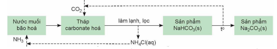 Trong công nghiệp, sodium hydrogencarbonate (baking soda) và sodium carbonate (soda) được sản xuất bằng phương pháp Solvay từ nguyên liệu chính là đá vôi, muối ăn, ammonia và nước. Quá trình sản xuất theo phương pháp Solvay bao gồm các công đoạn như trong sơ đồ sau: