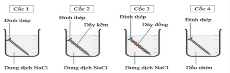 - Cho một đinh thép vào mỗi cốc 1 và cốc 4, cho đinh thép được quấn thêm dây kẽm (Zn) vào cốc 2, cho đinh thép được quấn thêm dây đồng (Cu) vào cốc 3 (các đinh thép là thép carbon thông thường và được làm sạch bề mặt).