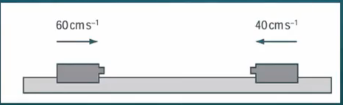 Hai vật có khối lượng bằng nhau chuyển động về phía nhau trên một đệm không khí không ma sát với tốc đọ $60~\text{cm}/\text{s}$ và 40 $\text{cm}/\text{s}$. Chúng dính vào nhau khi va chạm. Tốc độ của các vật sau va chạm là bao nhiêu cm/s ?
