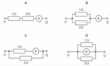 Trong mỗi mạch mắc điện trở, Ampe kế có điện trở là $2\mspace{6mu}\Omega$. Mạch điện nào Ampe kế có số chỉ lớn nhất khi cùng một hiệu điện thế được đặt vào các điểm $\text{P}$ và$\text{Q}$?