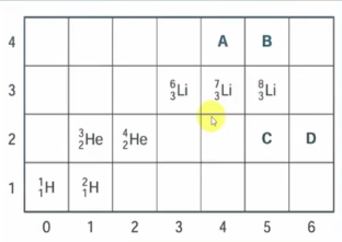 Bảng bên cho thấy một số hạt nhân được sẳp xếp theo số proton và số notron trong mỗi hạt. Một hạt nhân của hạt nhân ${}_{3}^{8}\text{Li}$ phân ră $\beta$-, hạt nhân thu được ở vị trí nào trên bảng ?