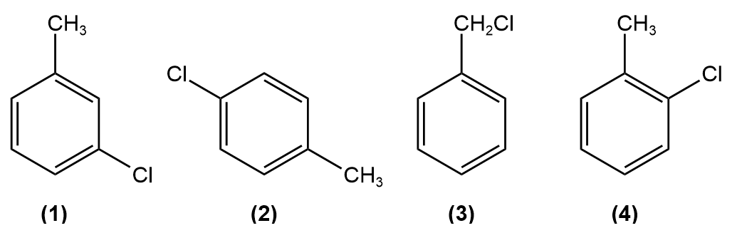 Trong các chất trên, những chất nào là sản phẩm chính khi cho toluene tác dụng với chlorine trong điều kiện đun nóng và có mặt FeCl3?