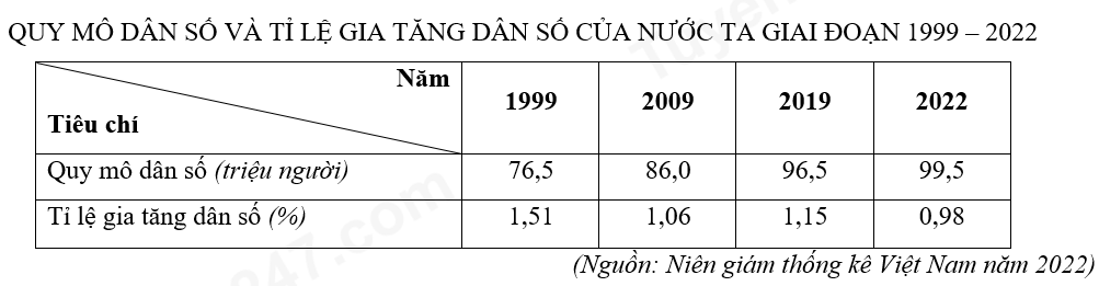 Dựa vào bảng số liệu, hãy chọn nhận xét đúng về quy mô dân số và tỉ lệ gia tăng dân số của nước ta giai đoạn 1999 – 2022.