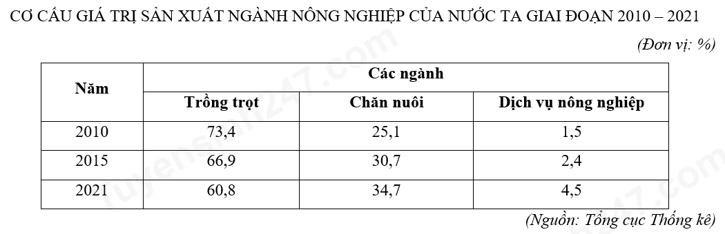 Dựa vào bảng số liệu, hãy chọn nhận xét không đúng về cơ cấu giá trị sản xuất ngành nông nghiệp của nước ta trong giai đoạn 2010 – 2021?