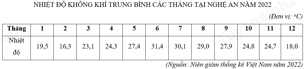 Dựa vào bảng số liệu, hãy cho biết biên độ nhiệt năm tại Nghệ An năm 2022 là bao nhiêu? (làm tròn kết quả đến hàng đơn vị của oC).