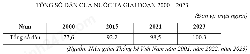 Dựa vào bảng số liệu, hãy cho biết dân số năm 2023 tăng bao nhiêu triệu người so với năm 2000? (làm tròn kết quả đến chữ số thập phân thứ nhất).