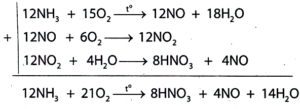 Giai đoạn 3. Tổng hợp nitric acid: $\left. 3\text{NO}_{2} + \text{H}_{2}\text{O}\rightarrow 2\text{HNO}_{3} + \text{NO} \right.$
