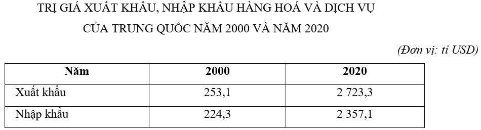 Theo bảng số liệu, để thể hiện cơ cấu trị giá xuất khẩu, nhập khẩu hàng hoá và dịch vụ của Trung Quốc năm 2000 và năm 2020, biểu đồ nào sau đây là thích hợp nhất?