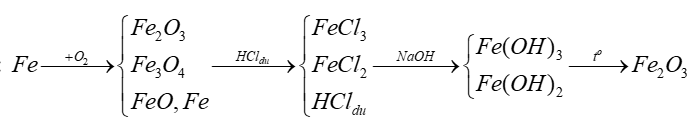 Để m gam bột iron ngoài không khí, sau một thời gian thu được hỗn hợp X gồm Fe2O3, Fe3O4, FeO và Fe. Hoàn tan hoàn toàn X trong lượng dư dung dịch HCl, thu được dung dịch Y chứa FeCl2, FeCl3 và HCl dư. Cho Y tác dụng với dung dịch NaOH, lọc lấy hỗn hợp các chất không tan là Fe(OH)2 và Fe(OH)3 rồi nung nóng trong không khí đến khối lượng không đổi, thu được 24 gam chất rắn Fe2O3. Tính giá trị m.