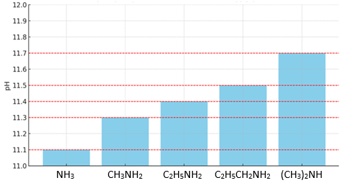 Chuẩn bị các cốc chứa dung dịch nồng độ 0,1M của các chất ở 25°C: NH3; CH3NH2; CH3CH2NH2; (CH3)2NH; CH3CH2CH2NH2. Dùng máy đo pH để do giá trị pH của dung dịch. Đồ thị thể hiện kết quả thu được như sau: