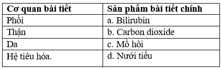 Bảng dưới đây mô tả cơ quan bài tiết chủ yếu và các sản phẩm bài tiết. Nội dung được ghép nối đúng là gì?