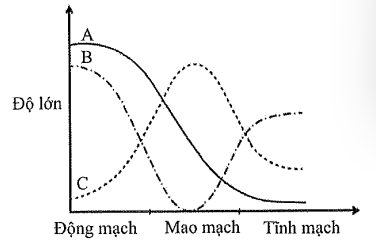 Phân tích sự thay đổi của 3 đại lượng vật lý khi máu di chuyển trong hệ thống mạch máu (Động mạch → Mao mạch → Tĩnh mạch) để xác định đường cong nào có giá trị giảm dần.