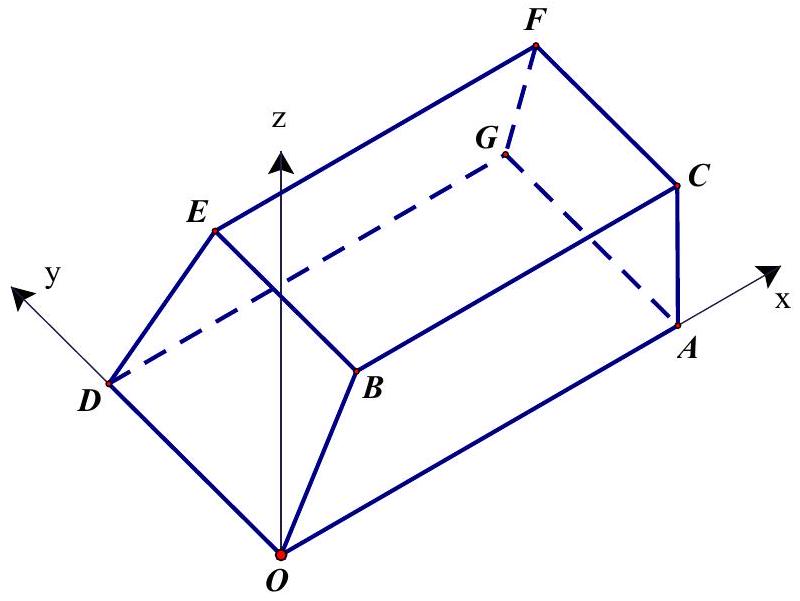 Một sân vận động được xây dựng theo mô hình là hình chóp cụt $OAGD \cdot BCFE$ có hai đáy song song với nhau. Mặt sân $OAGD$ là hình chữ nhật và được gắn hệ trục $Oxyz$ như hình vẽ (đơn vị trên mỗi trục tọa độ là mét). Mặt sân $OAGD$ có chiều dài $OA = 100\text{m}$, chiều rộng $OD = 60\text{m}$ và tọa độ điểm $B\left( {10;10;8} \right)$. Xét tính đúng sai của các khẳng định sau