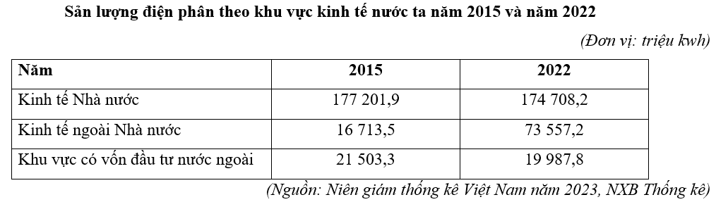 | a) Năm 2022 so với năm 2015, quy mô sản lượng điện của kinh tế Nhà nước giảm. | ||