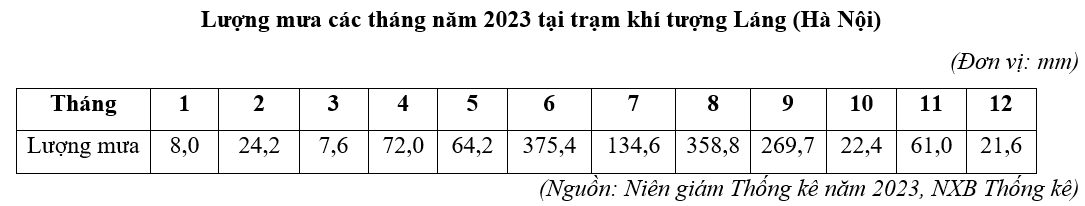 Căn cứ vào bảng số liệu trên, hãy cho biết chênh lệch lượng mưa giữa tháng cao nhất và tháng thấp nhất năm 2023 tại trạm khí tượng Láng (Hà Nội) là bao nhiêu mm (làm tròn kết quả đến hàng đơn vị).