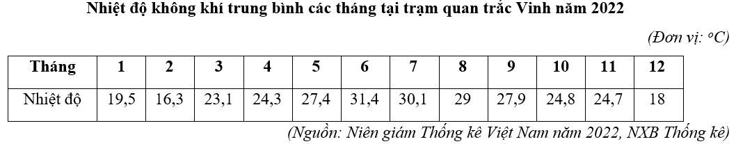 Căn cứ vào bảng số liệu trên, hãy cho biết nhiệt độ không khí trung bình năm 2022 tại trạm quan trắc Vinh là bao nhiêu oC (làm tròn kết quả đến một chữ số thập phân).