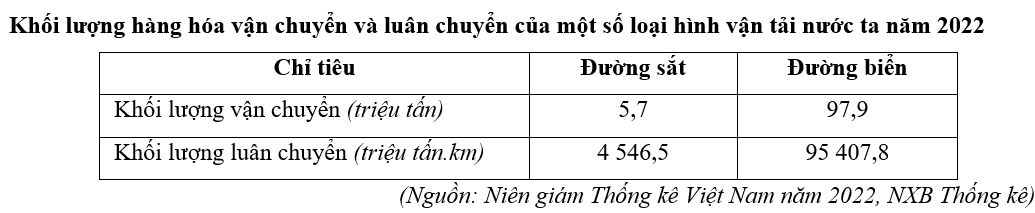 Căn cứ vào bảng số liệu trên, hãy cho biết cự li vận chuyển trung bình năm 2022 của ngành vận tải đường biển cao hơn đường sắt bao nhiêu km (làm tròn kết quả đến hàng đơn vị).