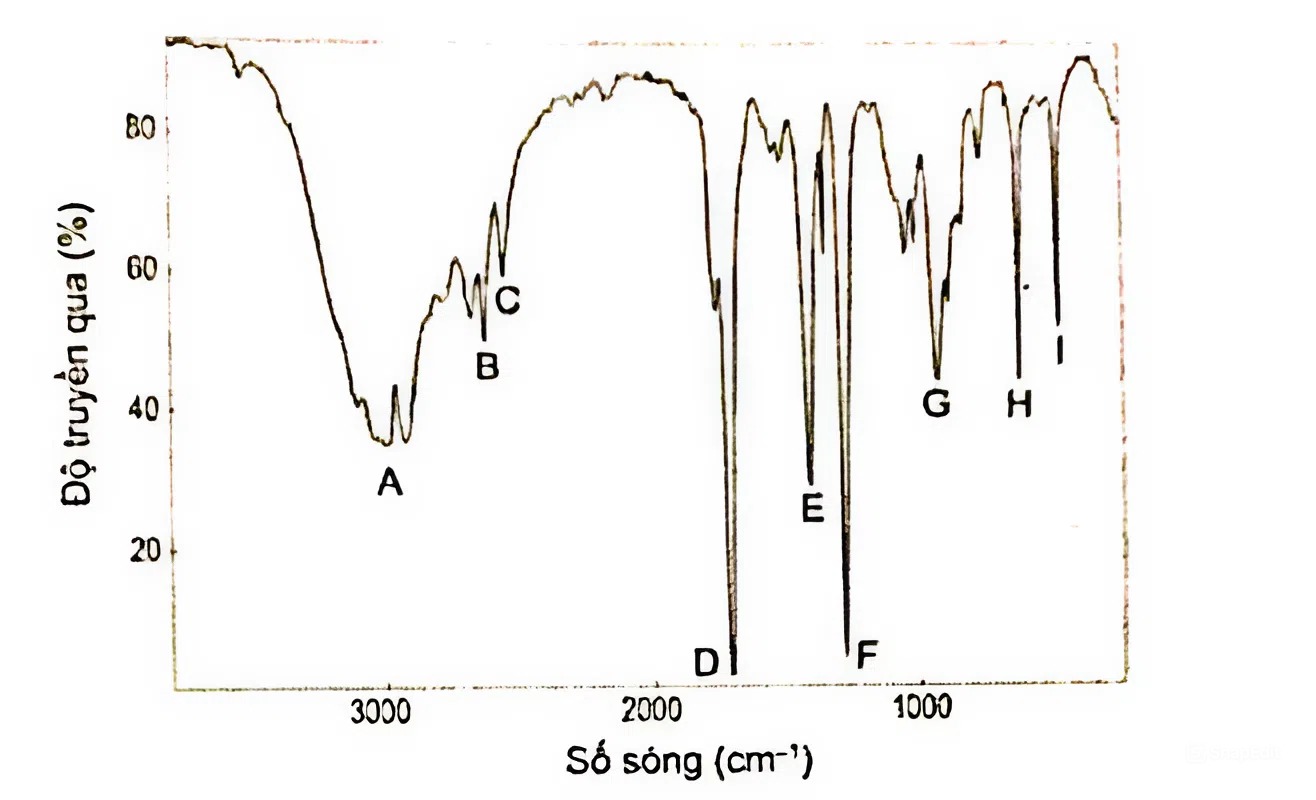 Chất (Y) này được sử dụng trong nhiều ngành công nghiệp khác nhau như tạo ra polymer trong công nghiệp sản xuất sơn, chất kết dính, là dung môi hoà tan các chất hoá học, sản xuất và bảo quản thực phẩm, đặc biệt dùng để sản xuất giấm. Dựa vào phổ hồng ngoại, hãy xác định peak nào có thể chứng minh nhóm chức –COOH có trong (Y)?