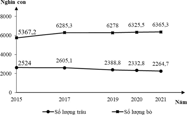 c) Dựa vào sự thay đổi số lượng trâu, bò của nước ta giai đoạn 2015 - 2021.