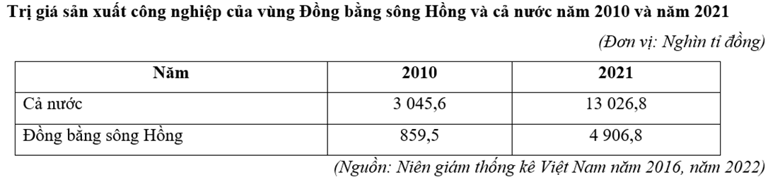 | a) Trị giá sản xuất công nghiệp của Đồng bằng sông Hồng tăng nhưng tỉ trọng trong cả nước giảm. | ||