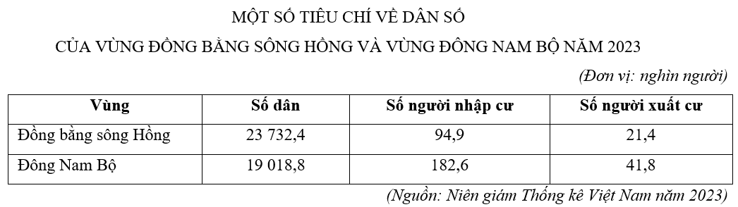 Căn cứ vào bảng số liệu, hãy cho biết tỉ suất gia tăng dân số cơ học năm 2023 của vùng Đông Nam Bộ nhiều hơn so với vùng Đồng bằng sông Hồng bao nhiêu ‰? (Làm tròn kết quả đến chữ số thập phân thứ hai)