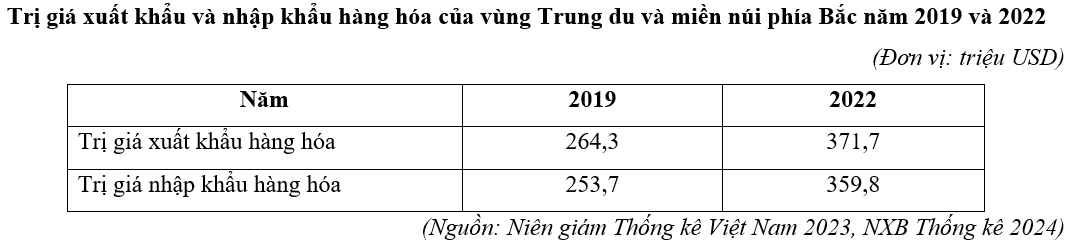 Căn cứ vào bảng số liệu trên, cho biết tổng trị giá xuất, nhập khẩu của vùng Trung du và miền núi phía Bắc năm 2022 lớn hơn tổng trị giá xuất, nhập khẩu năm 2019 là bao nhiêu triệu USD (làm tròn kết quả đến hàng đơn vị)