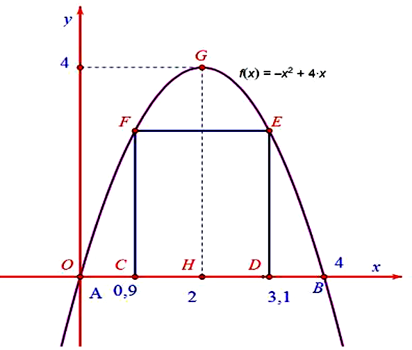 Đoàn trường THPT Quế Sơn dự định làm dự án ảnh trưng bày trên một pano có dạng parabol như hình vẽ bên dưới. Biết $AB = 4m,GH = 4m,AC = BD = 0,9m$. Đoàn trường sẽ yêu cầu các chi đoàn gởi ảnh dự thi và dán lên khu vực hình chữ nhật $CDEF$. Phần còn lại sẽ được trang trí hoa văn cho phù hợp. Chi phí dán hoa văn là 230.000 đồng cho một $m^{2}$ bảng. Tính chi phí cho việc hoàn tất hoa văn trên pano.